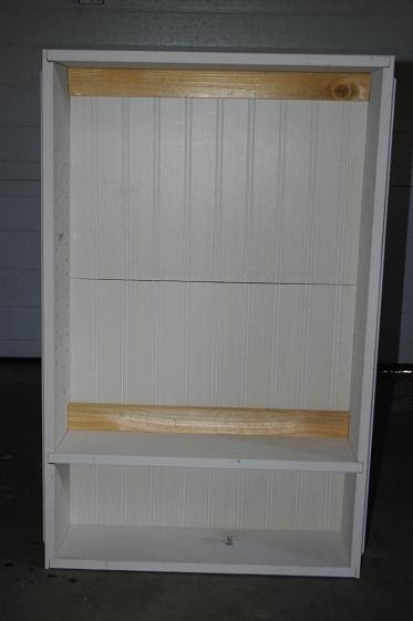 I used some scrap wainscot as the backing for this cabinet. I didn’t have one piece that was large enough to go over the whole thing so I used 2 pieces instead, making sure to line it up. It will be behind doors and will be less noticeable once painted.